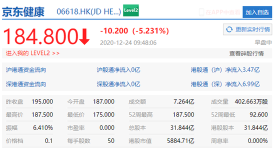 家电网-HEA.CN报道:12月24日上午消息,港股京东 健康(06618.HK)一度跌超10%,总市值5587亿港元。截至9时48分,京东健康下跌5.231%,报184.8港元,市值达5884.71亿港元。