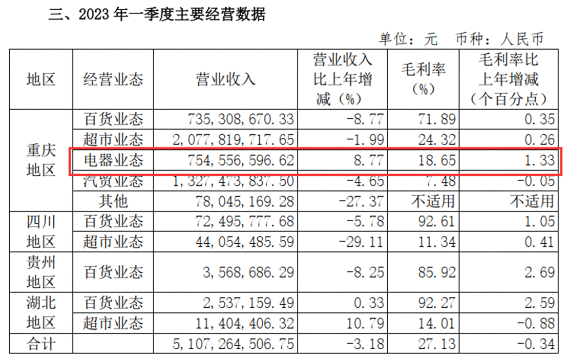 图片截自重庆百货大楼股份有限公司2023年一季度经营数据公告