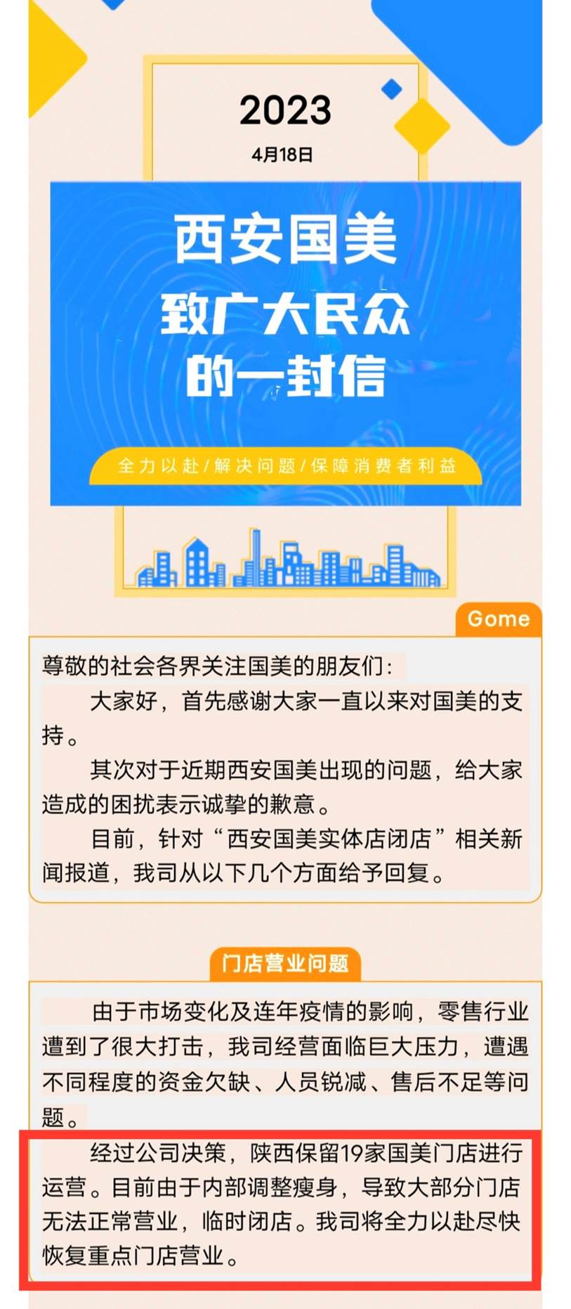 4月18日,陕西国美公众号发布《西安国美致广大民众的一封信》 ,其中提及“零售行业遭到了很大打击,我司经营面临巨大压力,遭遇不同程度的资金欠缺、人员锐减、售后不足等问题。经过公司决策,陕西保留19家国美门店进行运营。目前由于内部调整瘦身,导致大部分门店无法正常营业,临时闭店。”