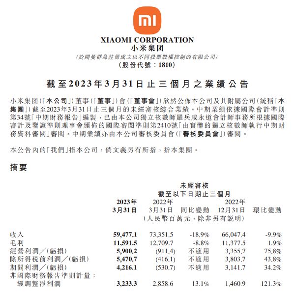 近日,小米集团(01810.HK)公布一季度业绩。财报显示,小米集团一季度总收入为人民币595亿元,经调整净利润为人民币32亿元;毛利为116亿元,同比减少8.8%。研发支出为41亿元,同比增长17.7%;其中智能电动汽车等创新业务费用为11亿元。