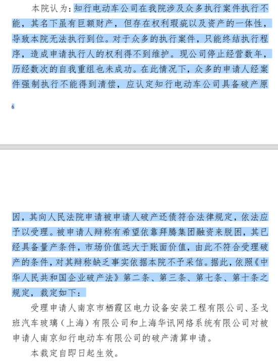 目前江苏省南京市栖霞区人民法院已裁定受理南京知行新能源汽车技术开发有限公司和南京知行电动汽车有限公司两家公司破产清算一案。