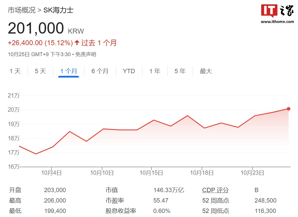 而 SK 海力士普通股市值为 146.328 万亿韩元(当前约 7511.02 亿元人民币),占 KOSPI 的 6.95%,创下历史新高。