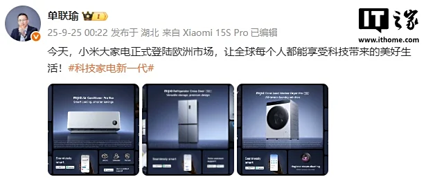 IT之家 9 月 25 日消息,小米集团大家电部总经理今日凌晨发文称:“今天,小米大家电正式登陆欧洲市场,让全球每个人都能享受科技带来的美好生活!”此外,他还分享了三张产品海报,分别为空调、冰箱、洗衣机。