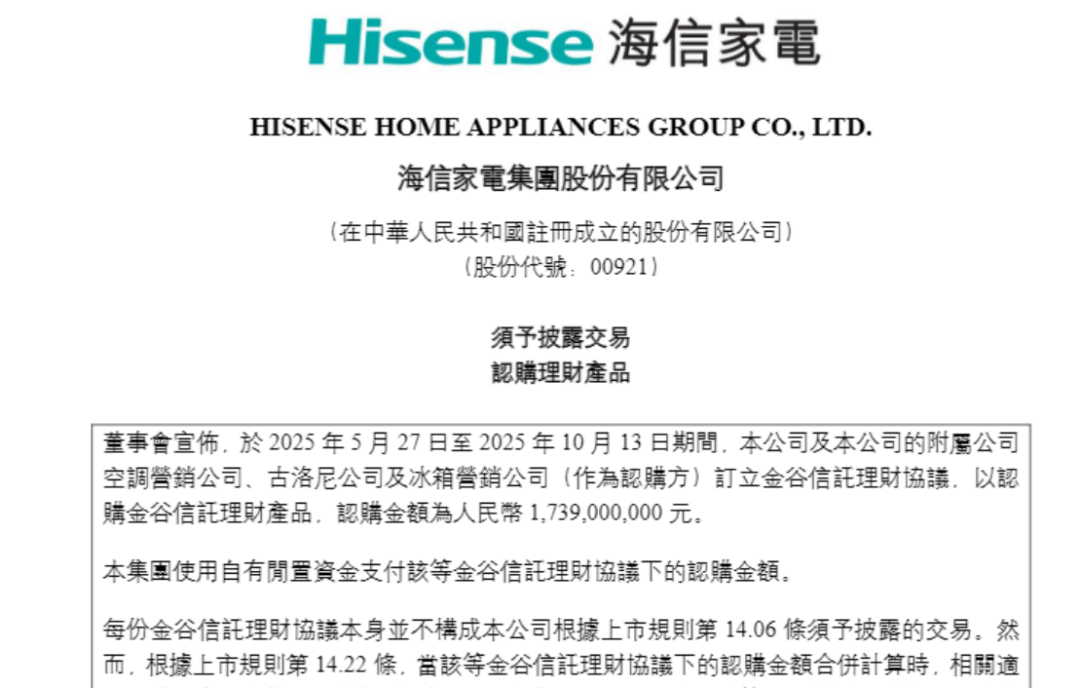 近日,《金融时报》记者关注到,“家电巨头”海信家电(000921)宣布,于2025年5月27日至2025年10月13日期间,公司及公司的附属公司空调营销公司、古洛尼公司及冰箱营销公司(作为认购方)订立金谷信托理财协议,以认购金谷信托理财产品,认购金额为人民币17.39亿元。