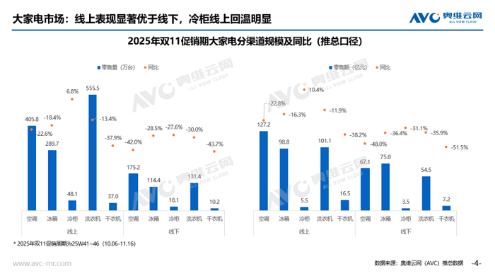 2025年双十一超长周期大促帷幕落下,京东战报显示11.11京东成交额再创新高,下单用户数增长40%,订单量增长近60%;天猫双十一全周期则实现“剔除退款后四年来最好增长”。平台战报重点从GMV转向用户增长和品牌表现,表明电商竞争已从规模扩张转向价值深耕的新阶段。奥维云网(AVC)推总数据显示,大家电各品类全渠道零售规模普遍收缩,但线上渠道与结构品仍表现出了较强韧性。