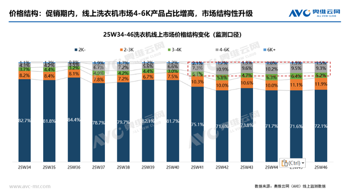 双十一促销期间,首周预热期的降价并未对整体市场起到消费刺激,企业进而选择稳步回升价格,双11(25W41-46)期间,线上价格同比增长0.01%。双十一线上主销价格段从1.5-2.2K回升至2.2-3K价格段,3-4K价格段同比增长4.4%,结构回升明显。
