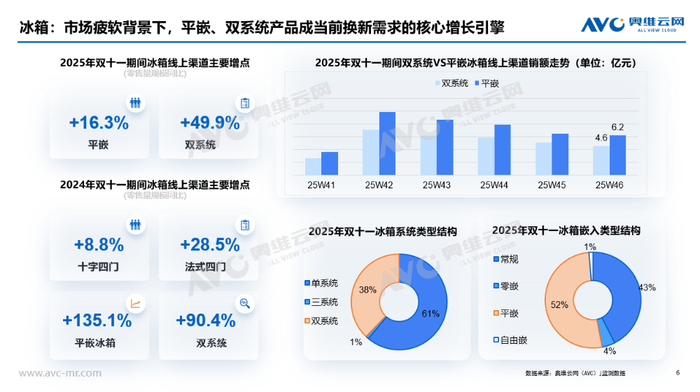 与去年双十一多点开花的局面不同,今年在整体市场承压的背景下,平嵌和双系统是今年双十一为数不多的两个增长亮点。根据奥维云网监测的统计数据显示,2025年刷双十一期间,平嵌冰箱零售量同比增长16.3%、双系统冰箱同比增长49.9%。平嵌冰箱的增长是消费者需求从“功能型”向“场景型和美学型”跃迁;双系统的增长则是消费者对“精准保鲜”的要求不断拔高。如果说平嵌冰箱的增长是 “为空间美学付费” ,那么双系统冰箱的增长就是 “为健康生活和技术精准性付费”。