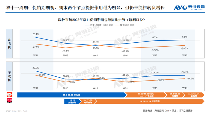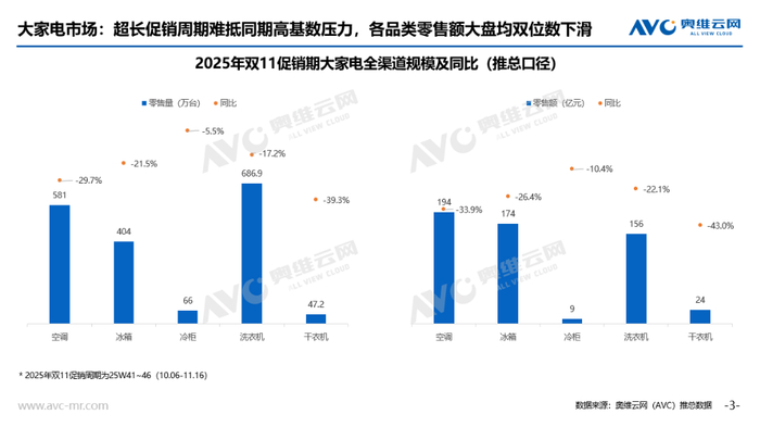 奥维云网(AVC)推总数据显示,2025年双十一促销期(W41-46),大家电市场整体呈现理性回调态势,空调、冰箱、冷柜、洗衣机、干衣机全渠道零售额分别降比33.9%、26.4%、10.4%、22.1%、43.0%。整体来看,除冷柜在线上渠道小幅提升以外,其他品类规模均显著下滑。可见,尽管双十一促销周期延长至6周,但超长促销周期仍难以抵消同期高基数的压力。