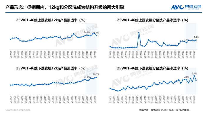 双十一促销期间,洗衣机市场的增长动力明确指向产品创新对价格段的结构性拉动。线上数据显示,12kg大容量与分区洗功能渗透率显著提升,其中以统帅、美的、小米为代表的“三区洗”一体化产品竞争尤为激烈。这一趋势在两方面重塑市场格局:一方面,强化了“分区洗”在用户端的心智认知;另一方面,推动竞争维度从单一维度转向价值链管理、产品创新与全域营销的综合较量。这一产品升级路径,直接带动了线上4K–6K中高端价格段的占比提升,体现出价值驱动已成为洗衣机市场结构升级的核心引擎。