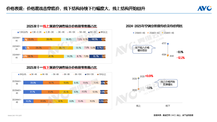 奥维云网(AVC)推总数据显示,2025年双十一促销期(W41-46),空调市场整体呈现大幅回调态势,全渠道零售额线上线下分别降低22.8%和48.0%。依托线上平台超长促销周期影响,整体表现虽优于线下,但同比降幅仍超2成。