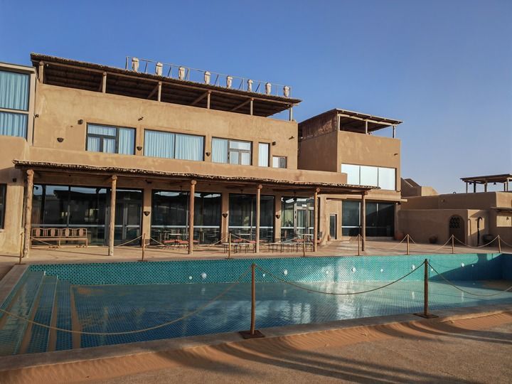 记者驱车前往宁夏中卫市,坐落在腾格里沙漠边缘的Tengol沙漠度假酒店,拥有沙漠同款“肤色”,外观粗粝古朴。