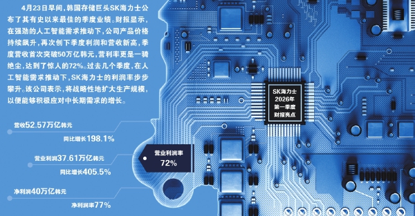 4月23日早间,韩国存储巨头SK海力士公布了其有史以来最佳的季度业绩。财报显示,在强劲的人工智能需求推动下,公司产品价格持续飙升,再次创下季度利润和营收新高,季度营收首次突破50万亿韩元,营利率更是一骑绝尘,达到了惊人的72%。过去几个季度,在人工智能需求推动下,SK海力士的利润率步步攀升。该公司表示,将战略性地扩大生产规模,以便能够积极应对中长期需求的增长。